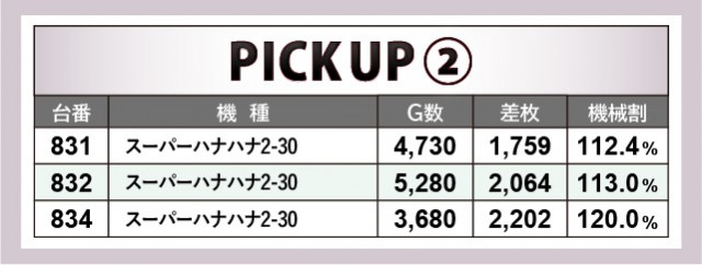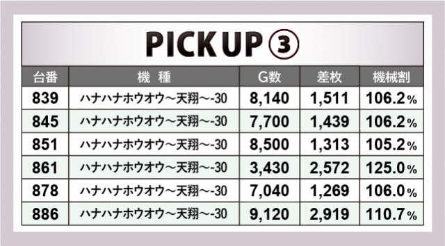 『スーパーハナハナ2-30』では2台の2千枚OVER台が発生し、遊技するファンはコンスタントに輝くハイビスカスにウットリしていた。同様に『ハナハナホウオウ~天翔~-30』でも熱気が放たれ、さらに活気にも溢れていたのが印象的だ。886番台+2,919枚という記録から、ドル箱に手を伸ばす光景を容易に想像できる。