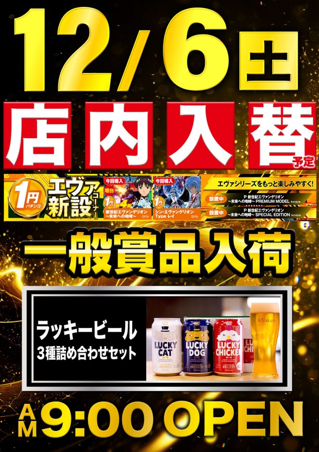明日12月6日(土)【一般賞品入荷予定】朝9時開店予定