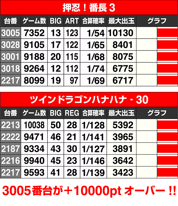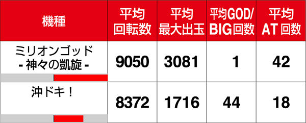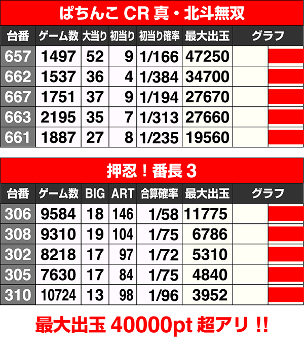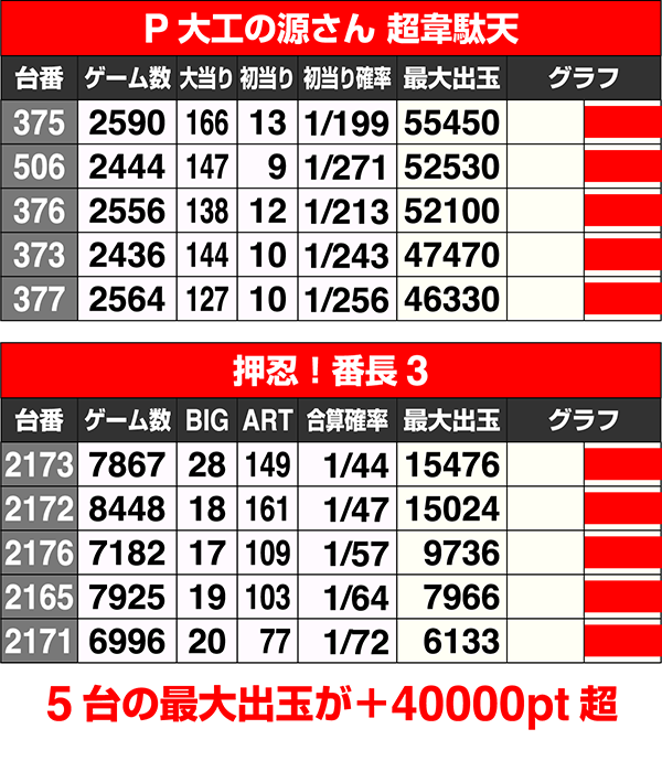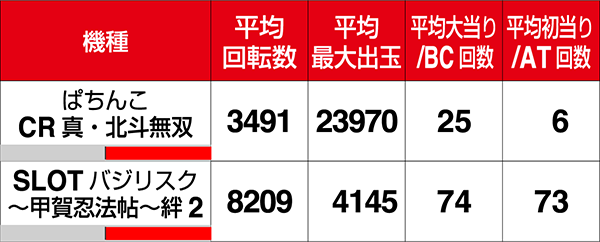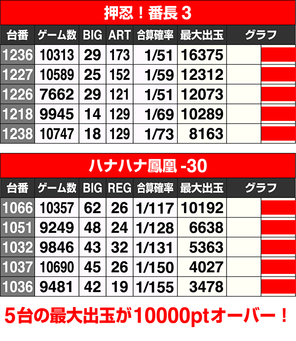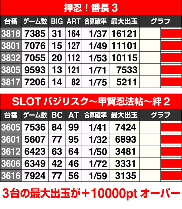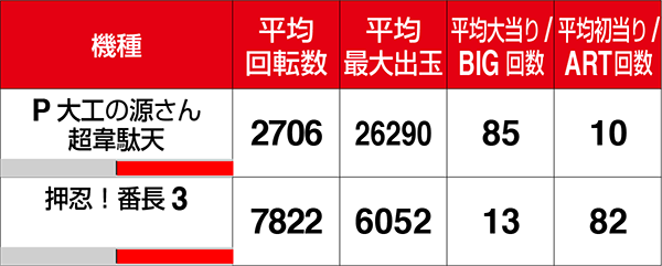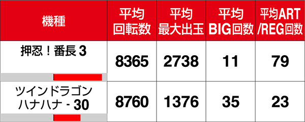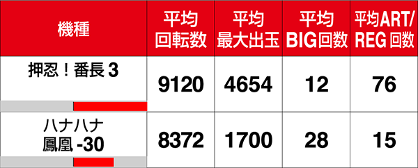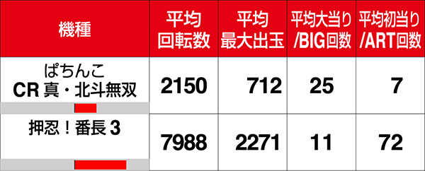 平均の最大出玉も3000ptを超え、『押忍!番長3』の3台は最大出玉が10000ptオーバーを記録した。