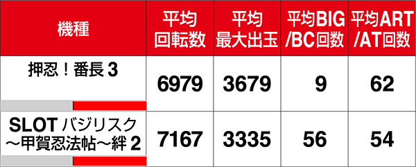 『押忍!番長3』と『SLOTバジリスク~甲賀忍法帖~絆2』はともに平均ゲーム数6000G超。