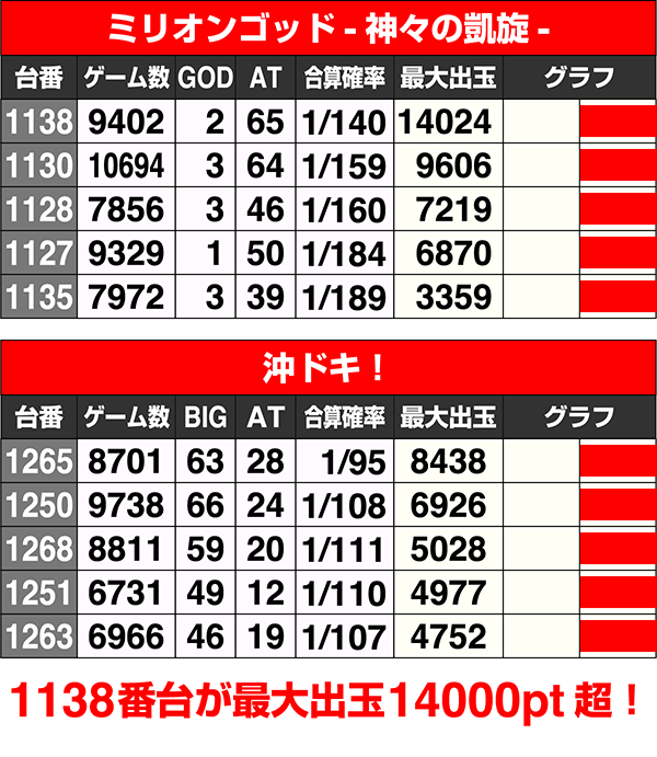 1138番台の『ミリオンゴッド-神々の凱旋-』は最大出玉が14000ptを上回った。
