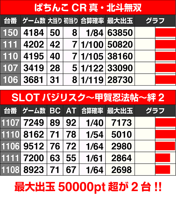 『SLOTバジリスク~甲賀忍法帖~絆2』はBC確率が高い台が多く、稼働率・合算確率ともに優秀な結果となった。