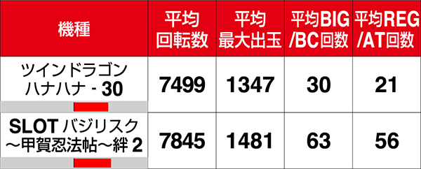 『ツインドラゴンハナハナ‐30』の平均BIG回数は35回。合算確率でみても魅力的な数字が並んだ。