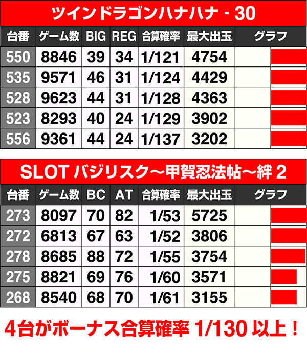 『ツインドラゴンハナハナ‐30』は4台がボーナス合算確率1/130以上で、最大出玉は4000ptクラスがずらり。