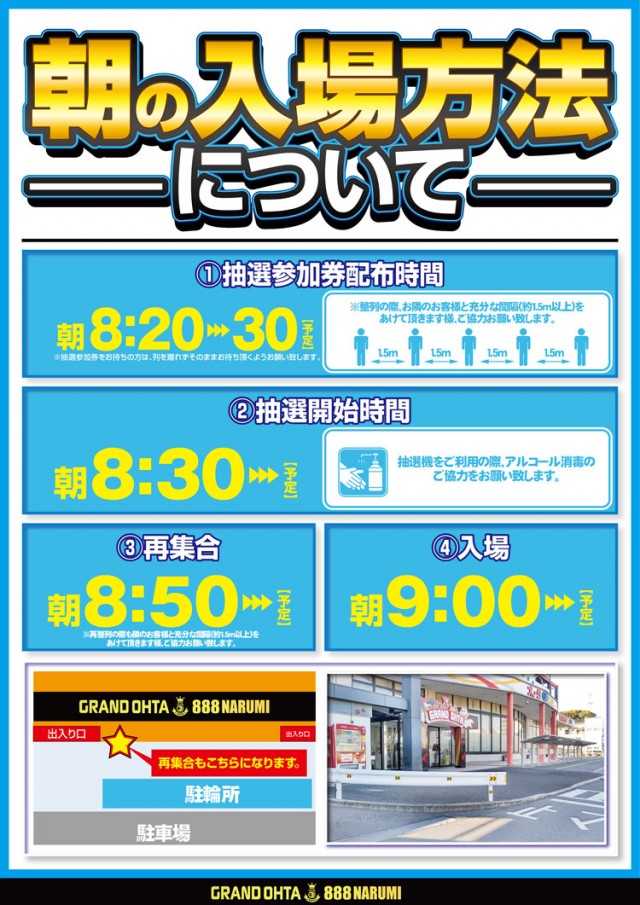 08:30 抽選開始 08:50 再整列 09:00 入場開始 |