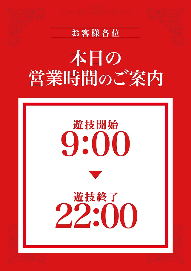 誠に勝手ではございますが、本日はこのあと18時のお時間をもちまして遊技終了とさせていただきます。