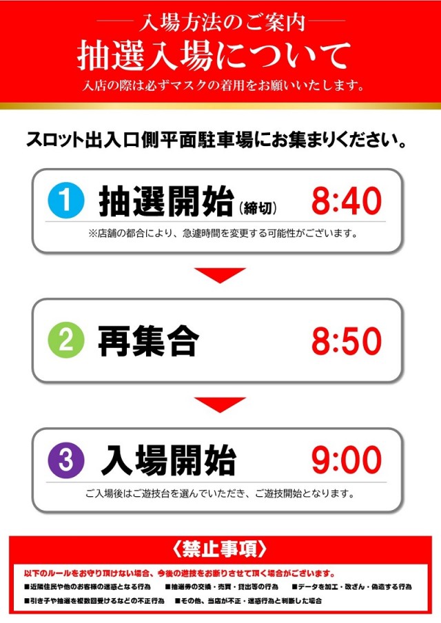 入場抽選のご案内■抽選開始:8時40分■再集合 :8時50分■入場開始:9時00分ご来店お待ちしております。 -