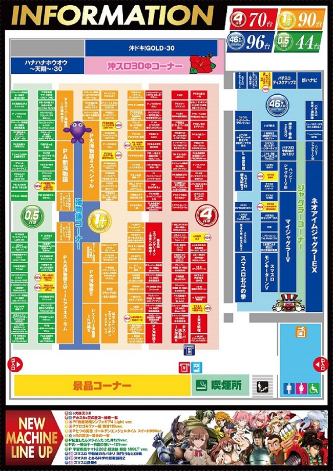 パチンコ:[4]70台[1.25]90台[0.5]44台 パチスロ:[46]96台 |