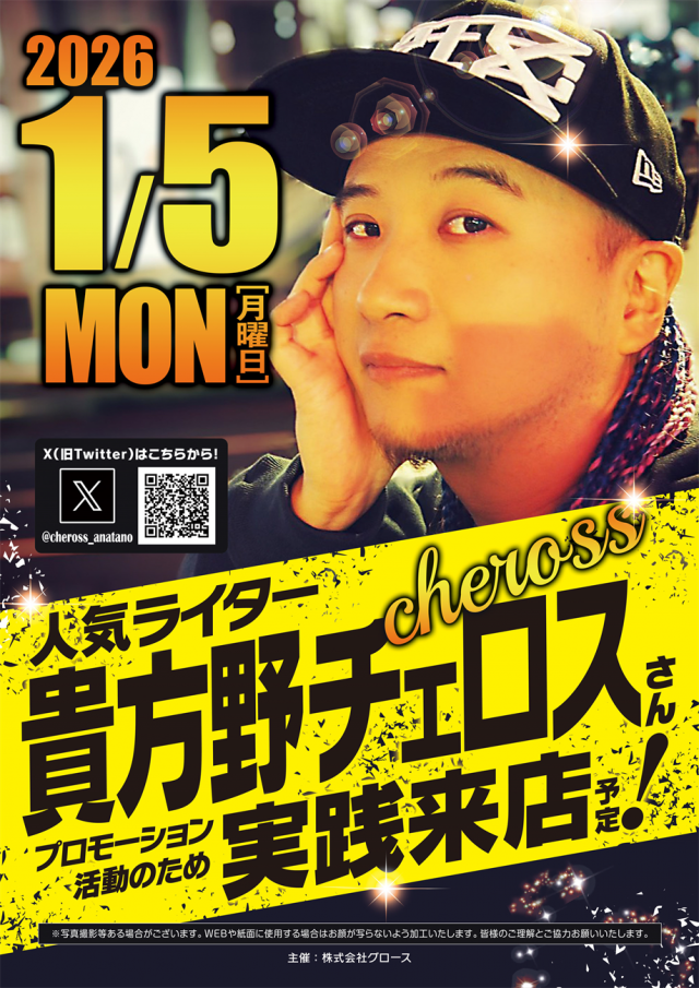 明日5日(月)【貴方野チェロスさん】実践来店予定☆朝9時開店