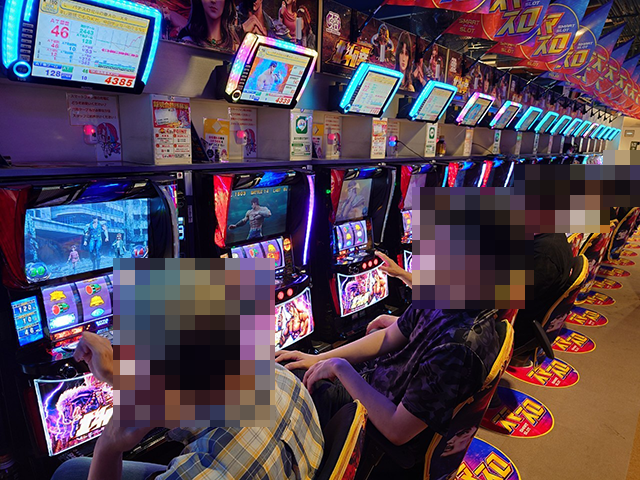 14時過ぎの「スマスロ北斗の拳」に空き台はなく、楽しげなプレイヤーも多い。