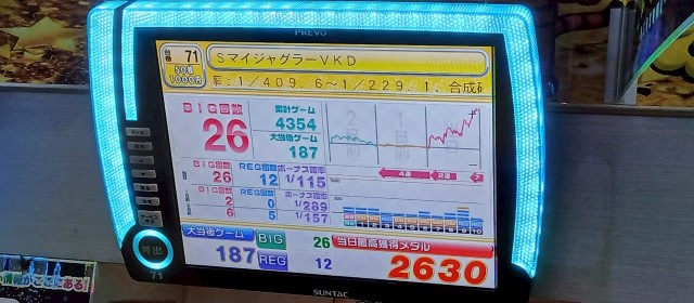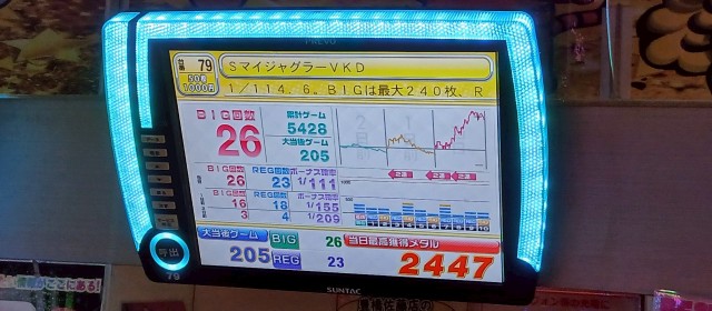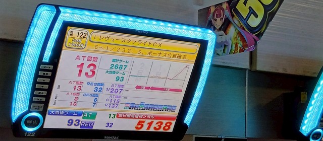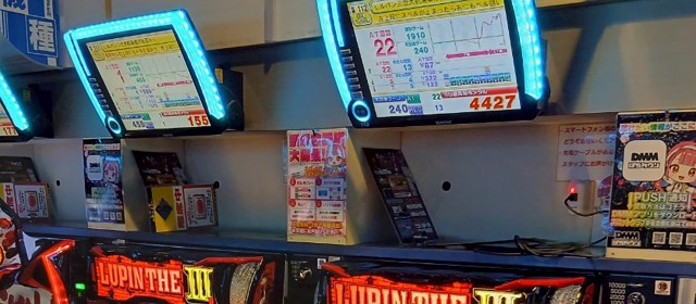 『スマスロモンキーターンⅤ』『L 少女☆歌劇 レヴュースタァライト -The SLOT-』を筆頭に『Lルパン三世 大航海者の秘宝』『スマスロ ゴッドイーター リザレクション』『パチスロ かぐや様は告らせたい』『スマスロ 緑ドン VIVA!情熱南米編 REVIVAL』と、幅広いラインナップの台上カウンターには華々しい数字が映し出されていた。