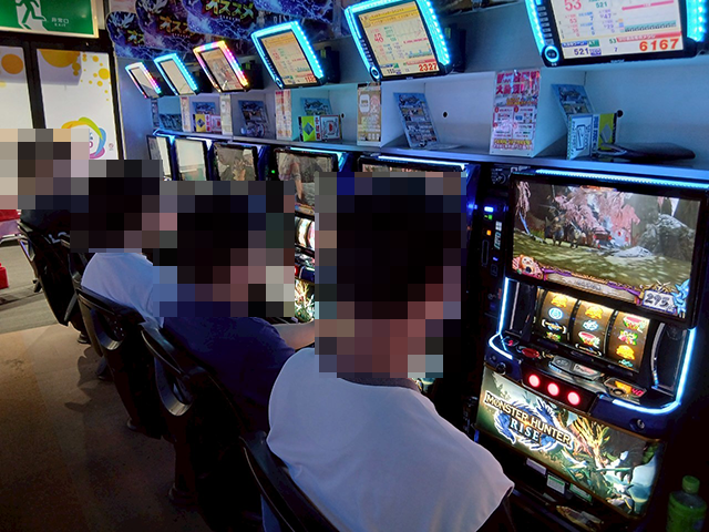 店内では、「スマスロ モンスターハンターライズ」と「パチスロ かぐや様は告らせたい」がとくに活況となっていた。