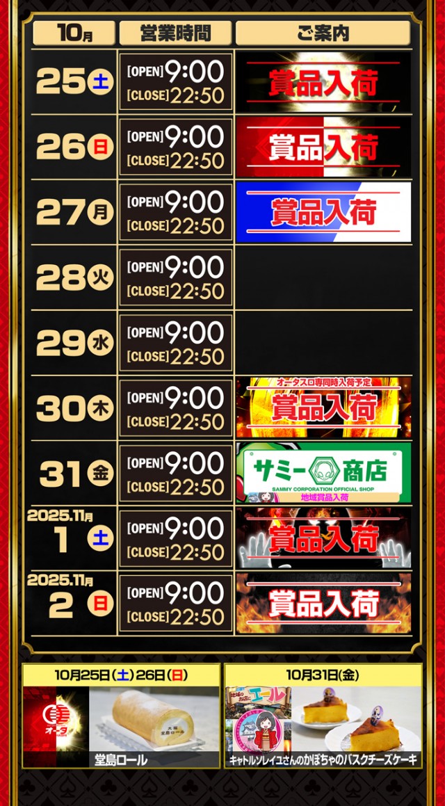 年中無休 ※新台入替前日には店休日を頂きます。 |
