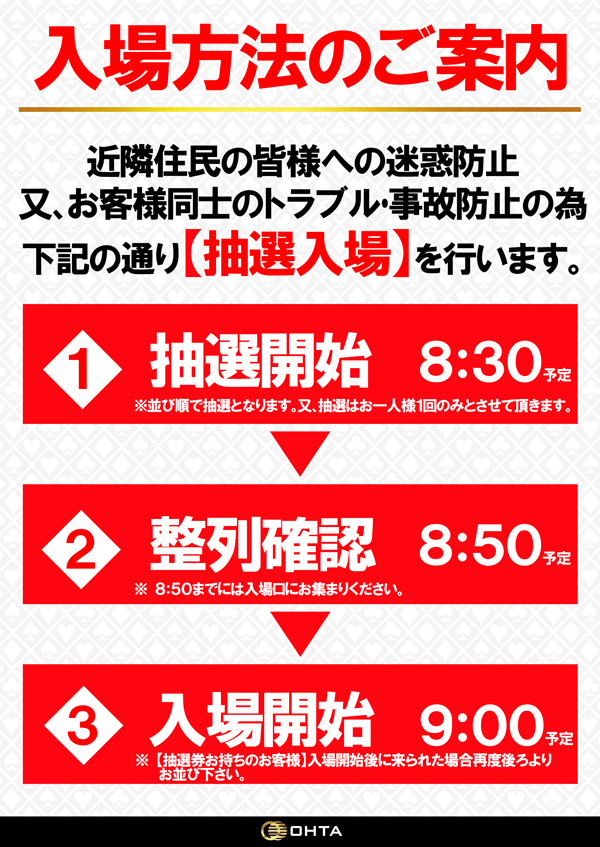 8:30より正面入口にて抽選を開始します。再整列は8:50を予定しております。そのお時間までに入口付近にお集まりください。時間内に戻られない場合は順番を飛ばす可能性もございますのでご了承くださいませ。 |