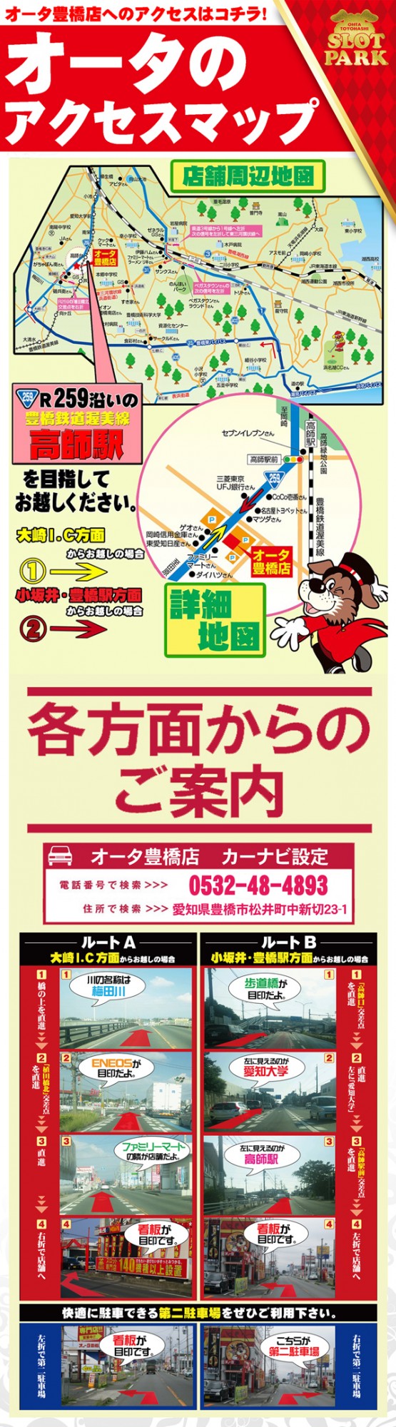 国道259号線沿い、豊橋鉄道渥美線高師駅から徒歩5分。 |