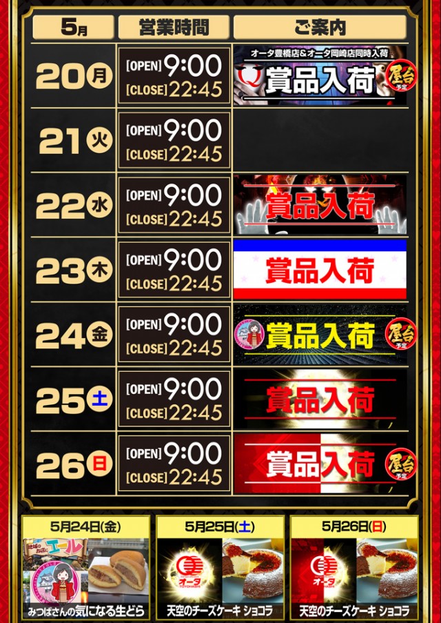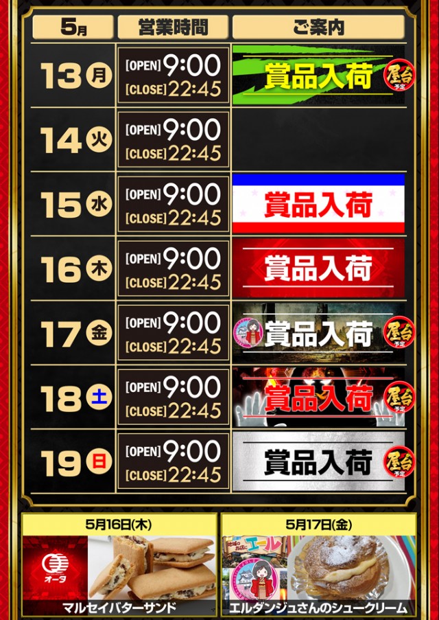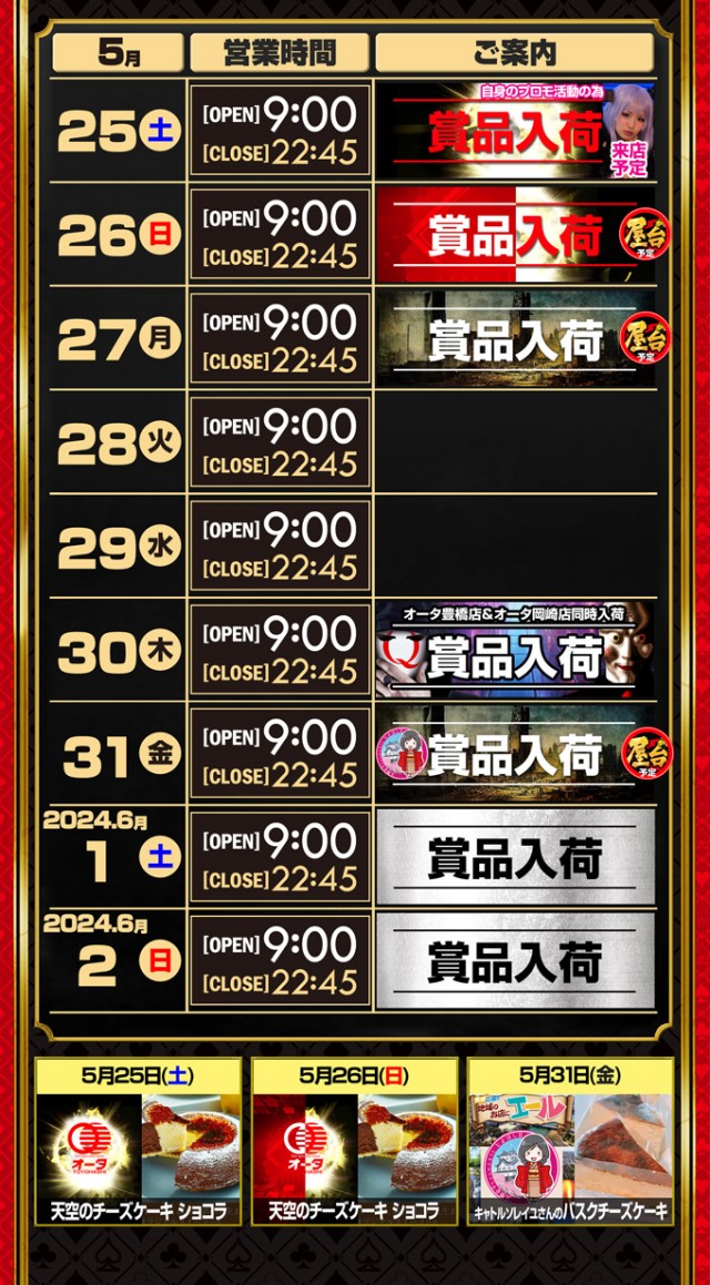 年中無休 ※新台入替前日には店休日を頂きます。 |
