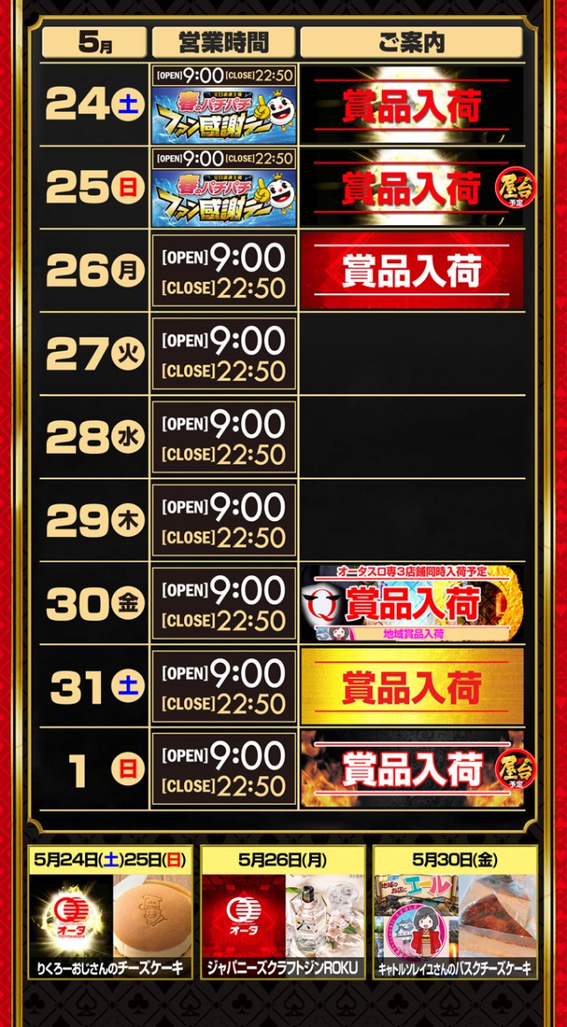 5月26日【月】★賞品入荷★抽選は8:30開始予定!