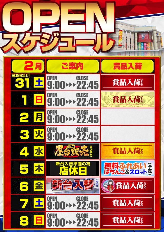 2月1日(日)本日賞品入荷予定!!
