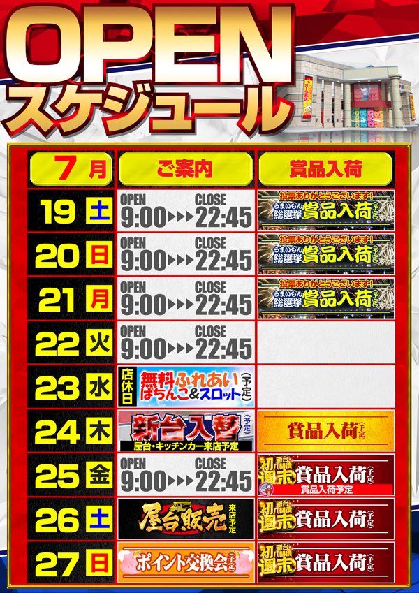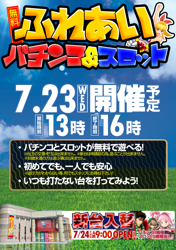 7月23日(水)本日店休日&ふれあいパチンコ開催予定!