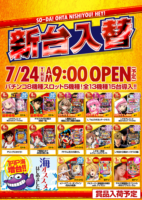 7月20日(日)★賞品入荷★朝9時OPEN予定!