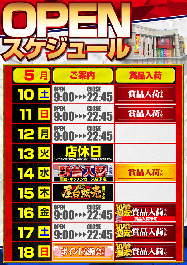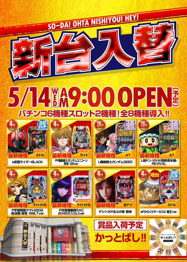 5月14日新台入替&賞品入荷予定 ★朝9:00オープン!!