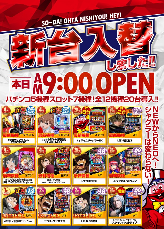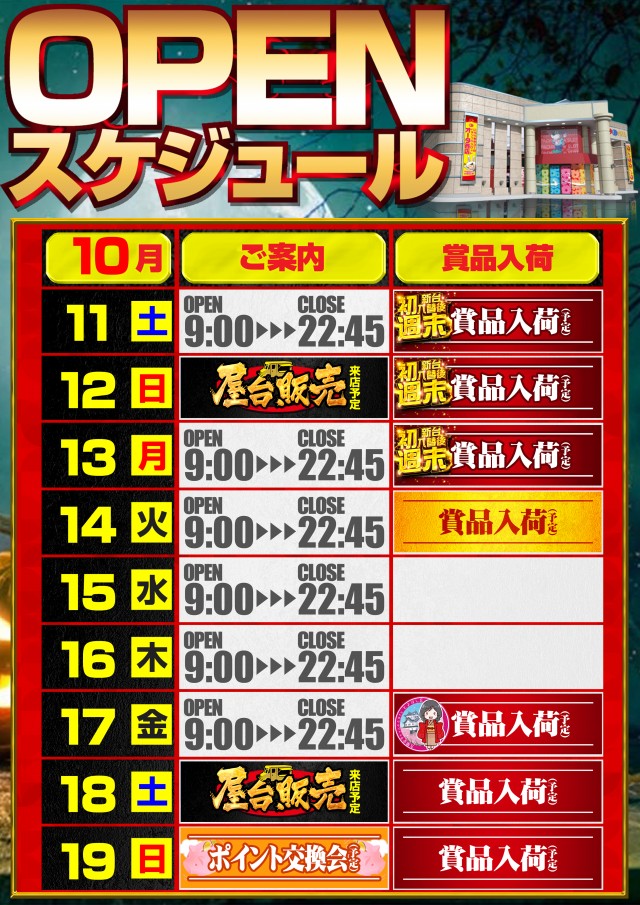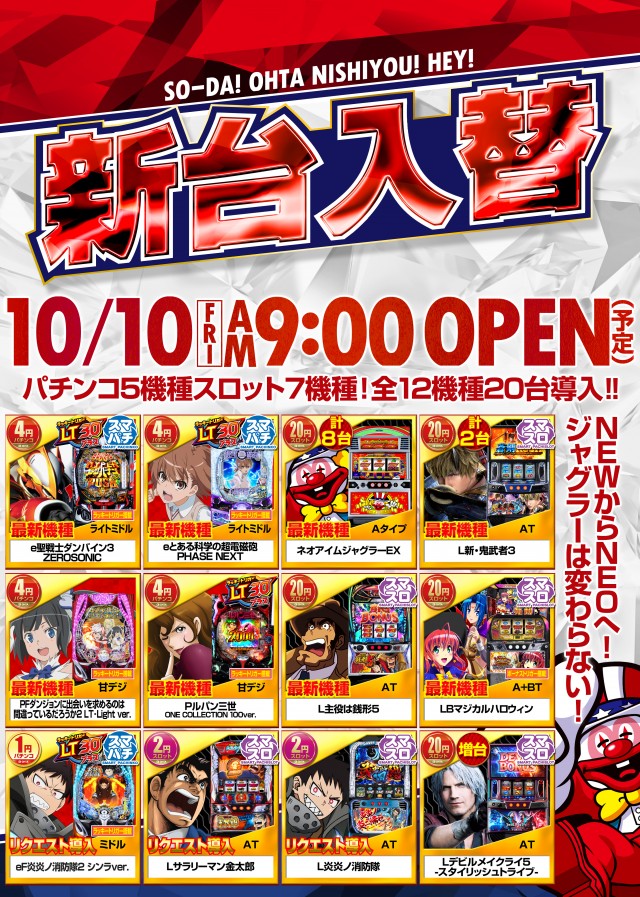 10月10日(金)本日新台入替朝9時OPEN予定!!