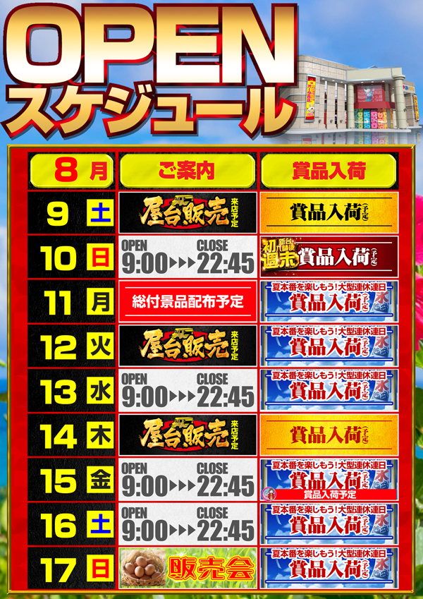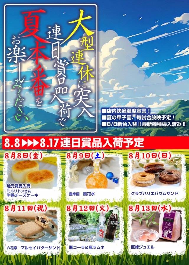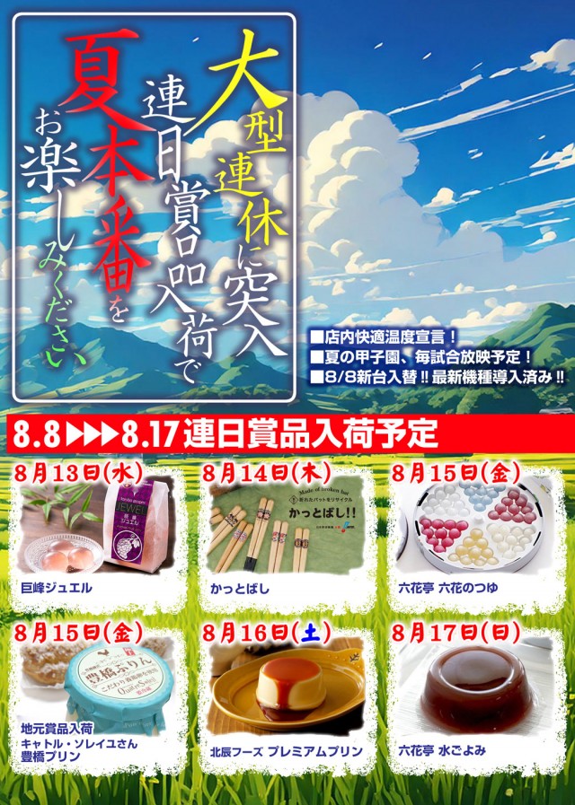 8月10日(日)★連日賞品入荷★朝9時OPEN予定!★