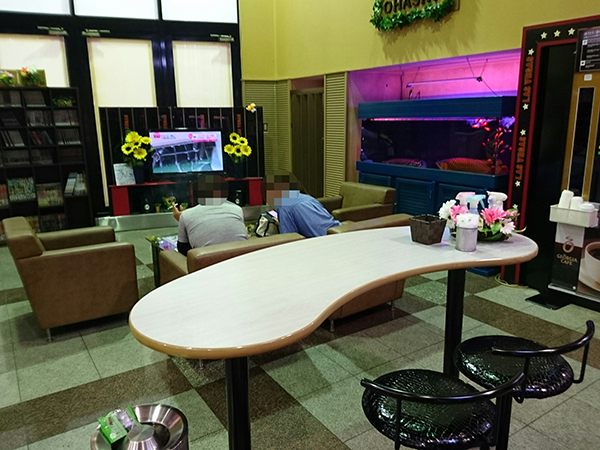 同店のレストスペースは、幅広いジャンルの漫画本やテレビが用意されているだけでなく、ソファーでゆっくりとリラックスをすることも可能。また、景品コーナーにパチスロのキャラクターグッズなどが豊富に揃えていることも魅力に感じる。