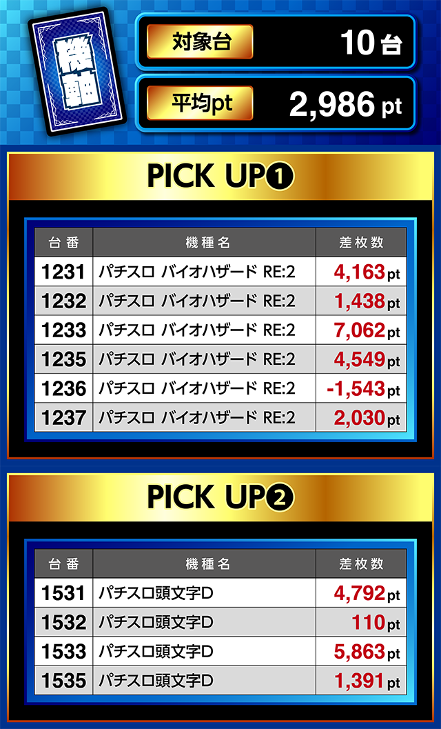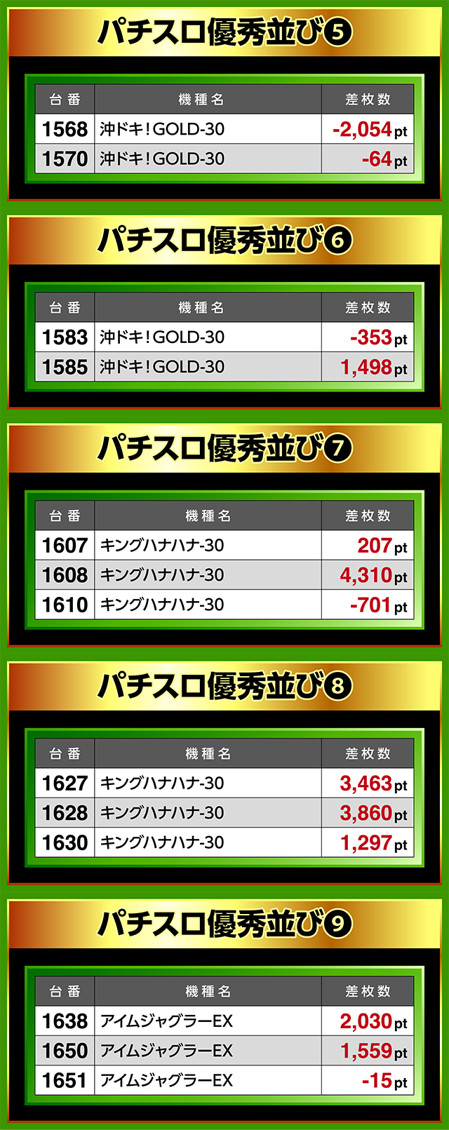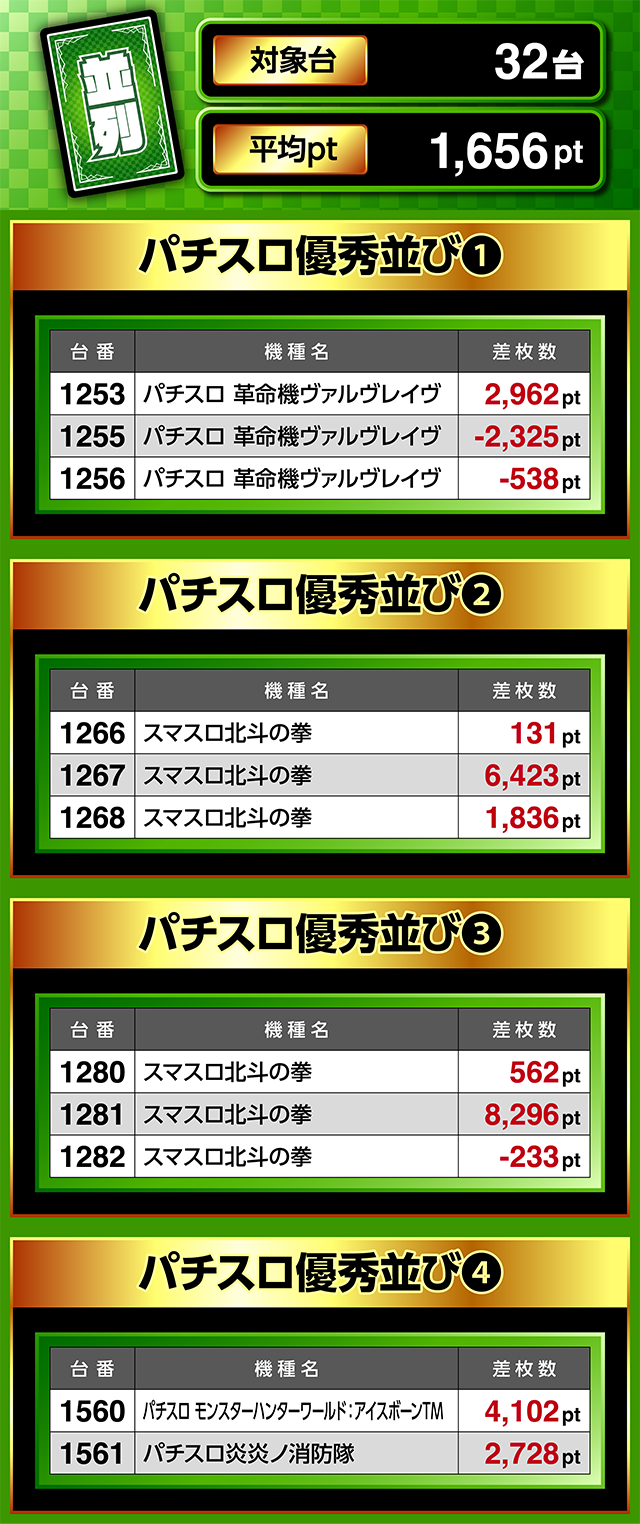 1560番台の「パチスロ モンスターハンターワールド:アイスボーンTM」は4,102pt、1561番台の「パチスロ炎炎ノ消防隊」も2,728ptと、多くの場所に好結果が並んだ。