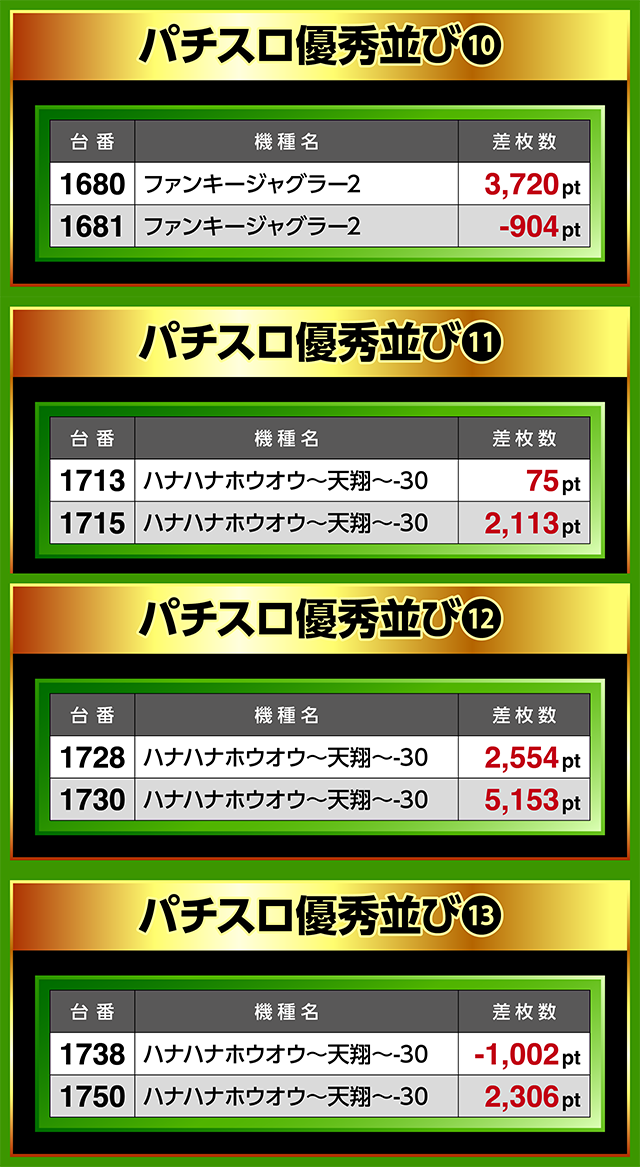 1728番台と1730番台の「ハナハナホウオウ~天翔~-30」は、2,554ptと5,153ptを記録。