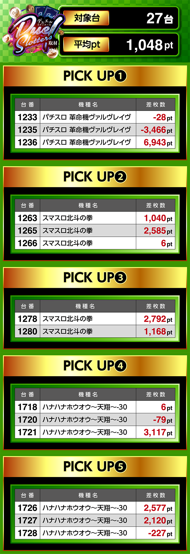 1263番台から1266番台までの「スマスロ北斗の拳」が並んでプラスとなり、1265番台が2,585pt。