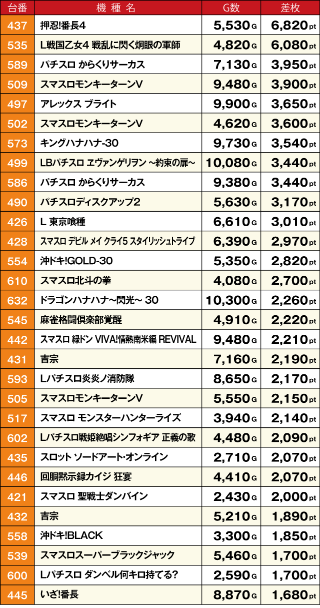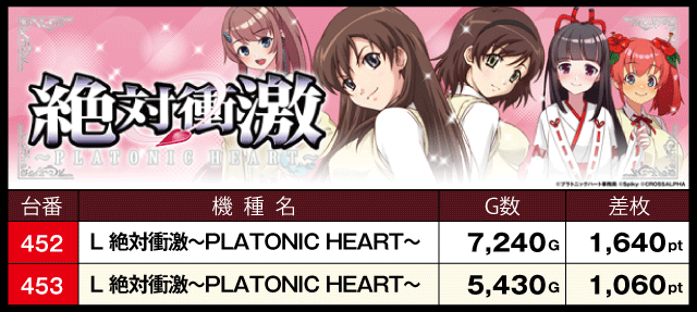 次に、優秀機種の状況を見ていこう。『スマスロスーパーブラックジャック』は全3台中2台、『L 絶対衝激~PLATONIC HEART~』は設置されている2台が共にプラス差枚となる見事な結果に。さらに、『パチスロ からくりサーカス』からは+3,000枚超が2台も発生しており、それぞれのシマは常に活気に溢れる一日となっていた。