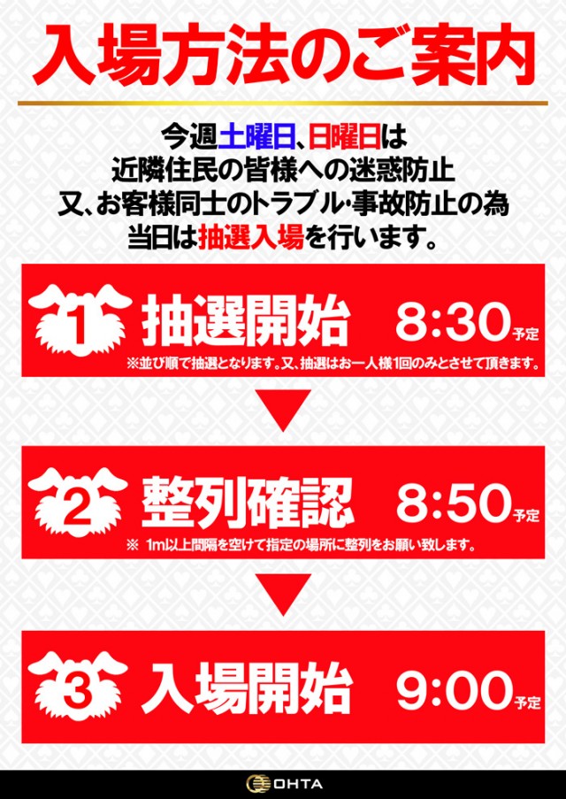 平日はお並び順、土日祝・入替初日の混雑が予想される日に関しては8:30から抽選開始 |