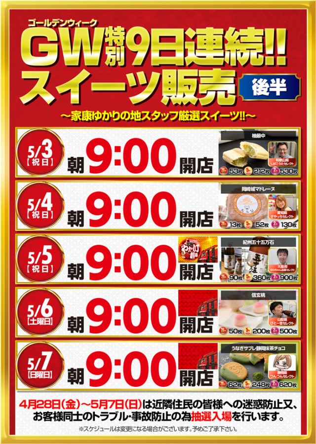 平日はお並び順、土日祝・入替初日の混雑が予想される日に関しては8:30から抽選開始 |