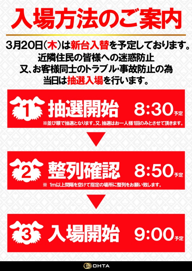 本日3月20日(木)新台入替初日!抽選8時30分から!