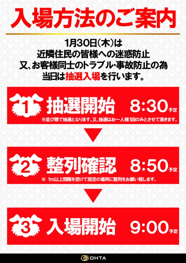 平日はお並び順、土日祝・入替初日の混雑が予想される日に関しては8:30から抽選開始 |