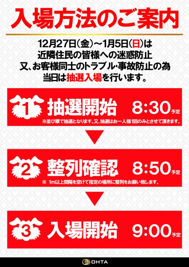 29日(日)年末年始は8時30分から抽選入場になります!