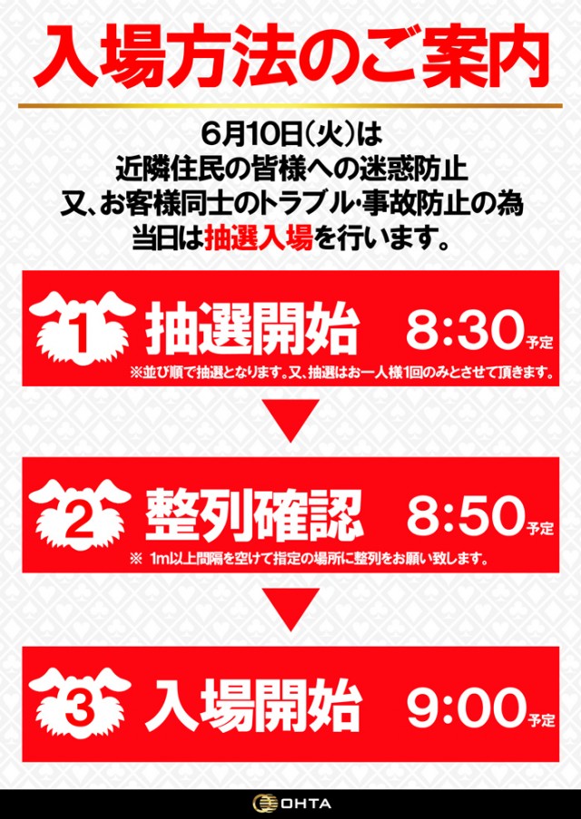 平日はお並び順、土日祝・入替初日の混雑が予想される日に関しては8:30から抽選開始 |