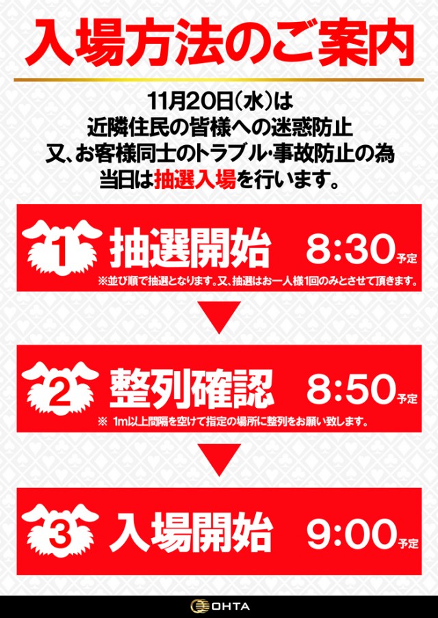 11月20日(水)抽選時間8時30分!賞品入荷いたします!