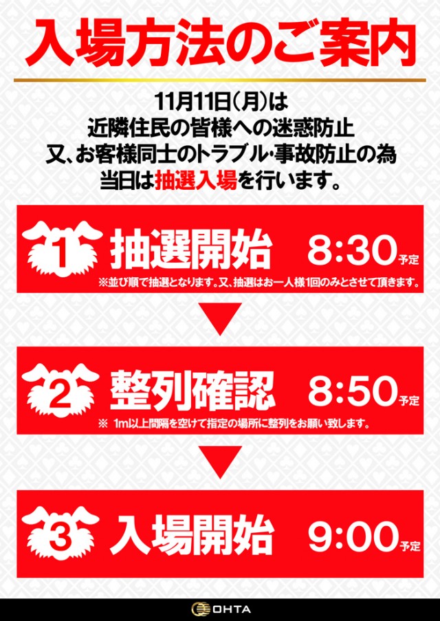 平日はお並び順、土日祝・入替初日の混雑が予想される日に関しては8:30から抽選開始 |