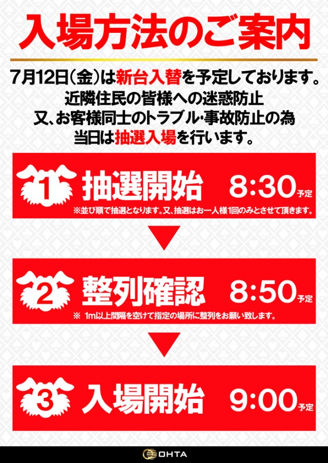 本日7月12日(金)☆新台入替初日☆8:30抽選開始です!