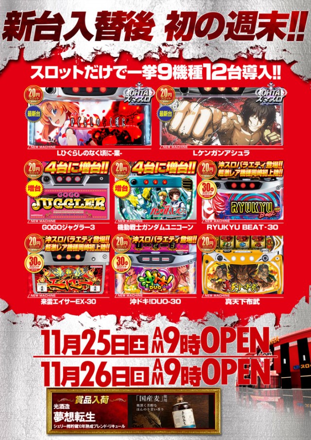 明日11月25日(土)新台入替後初の週末!朝9時フルオープン