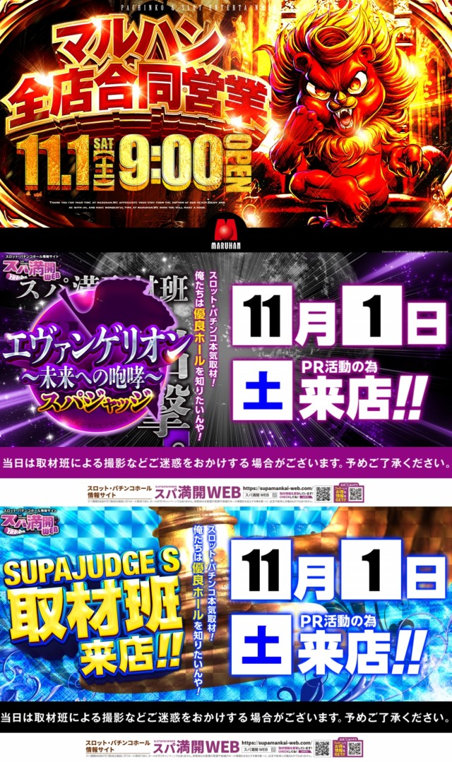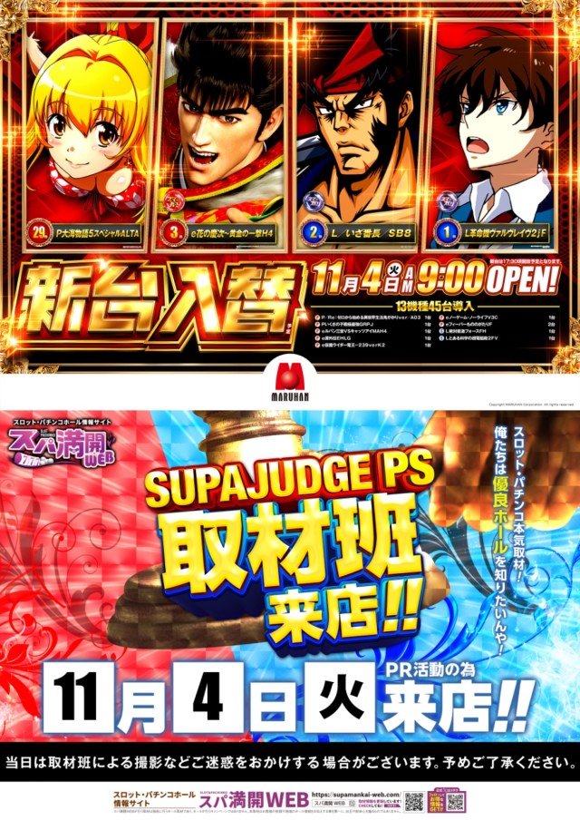 11月4日(火)【新台入替&スパジャッジPS】あさ9時開店!