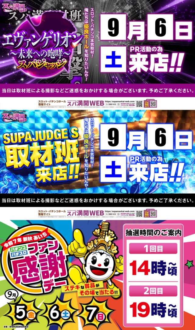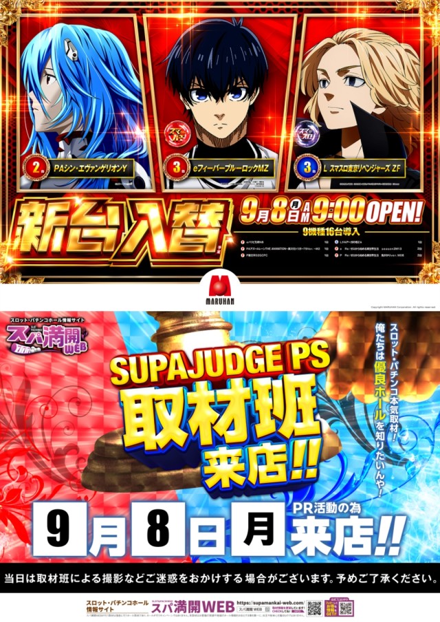 9月8日(月)【新台入替&取材班来店】あさ9時開店!!