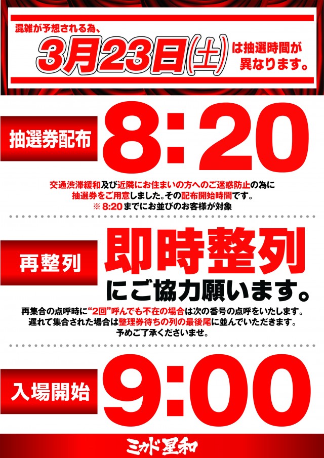 明日3月24日!朝9時開店!抽選時間は朝8時40分スタート