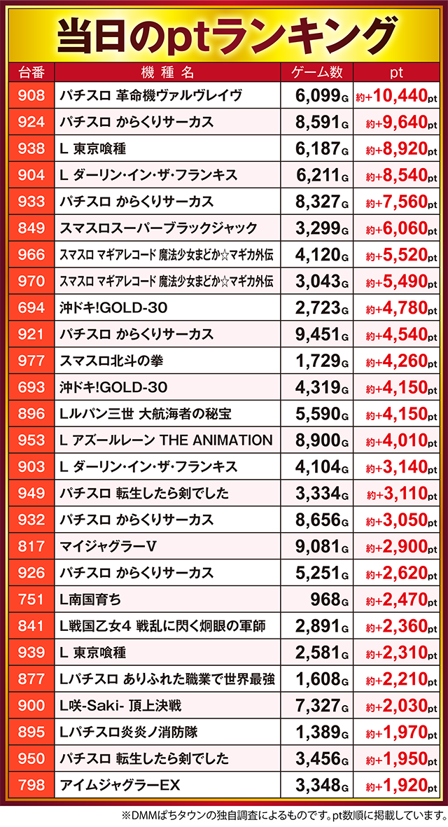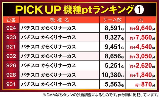 「パチスロ からくりサーカス」の6台が約+1,800pt以上。