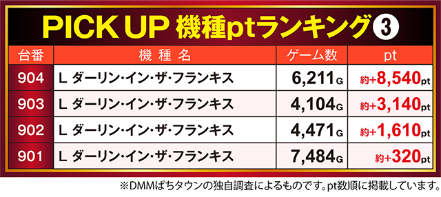 最新機種も活気があり、「L ダーリン・イン・ザ・フランキス」の904番台が約+8,540pt。