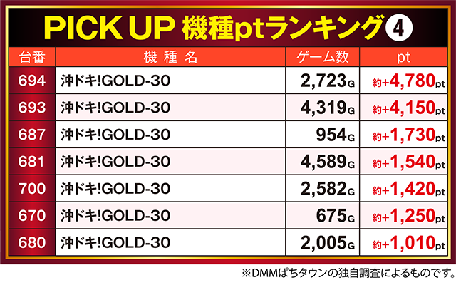 7台が約+1,000ptを上回った「沖ドキ!GOLD-30」では、694番台と693番台が約+4,100ptオーバー。