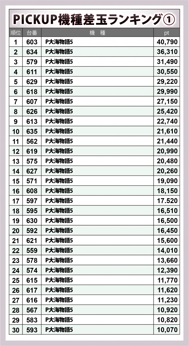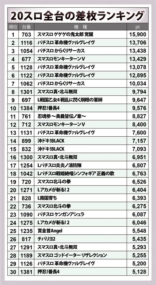 ベスト30のスコアを挙げていくと、603番台の+4万1千弱に始まり、+3万超×3・+2万超×26と、全30台が5桁の差玉を成し遂げた。
