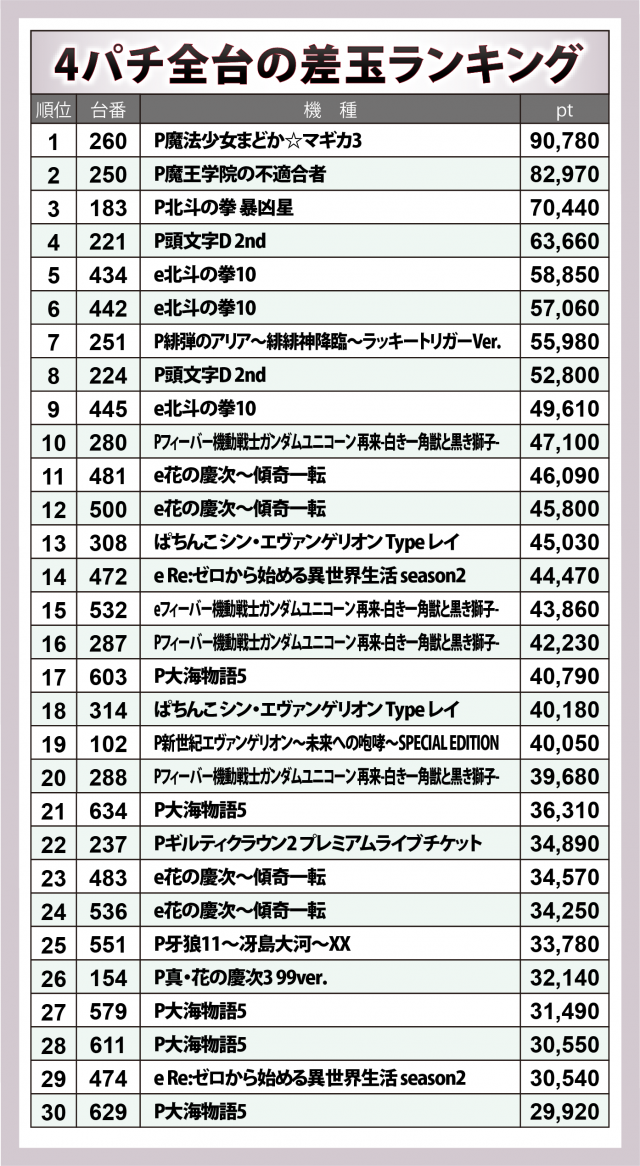 続いて4パチも同じく優秀30台をチェック。ランキングにはラッキートリガー搭載機の躍進が光った。